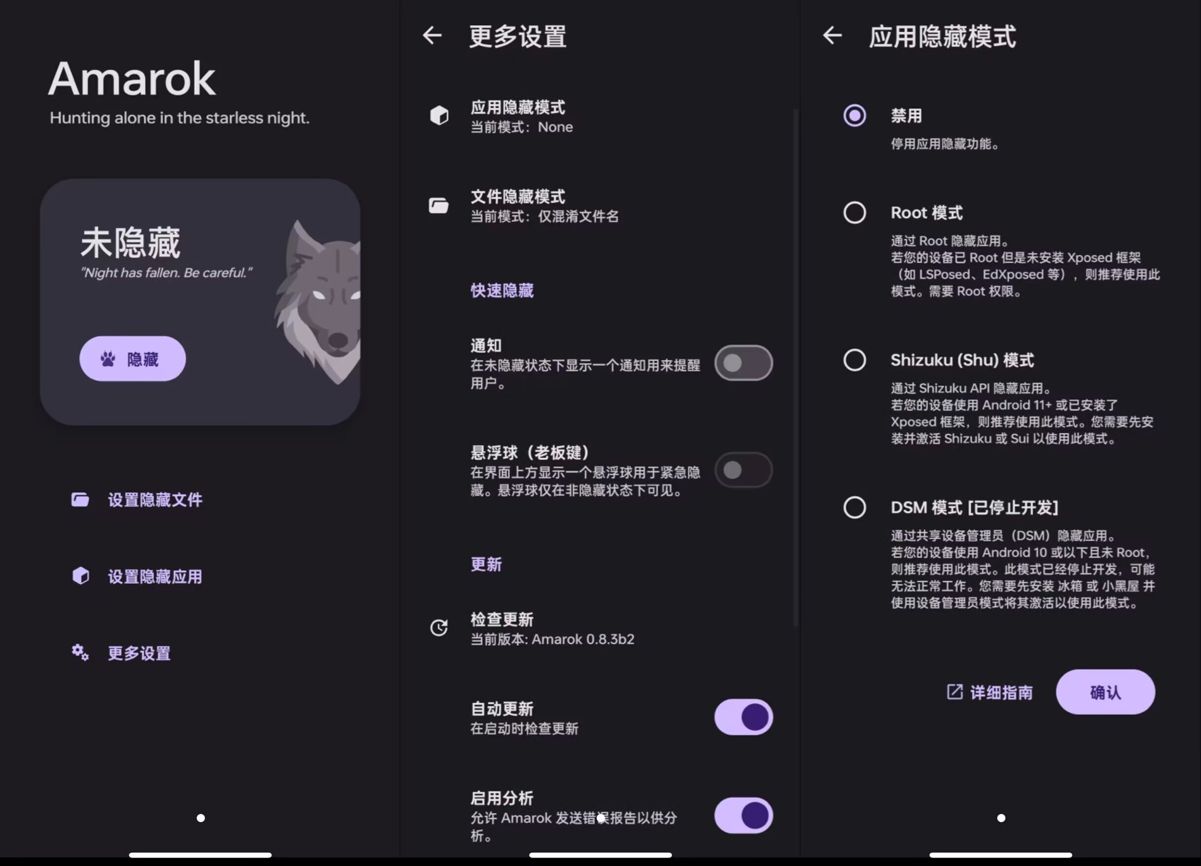多模式免Root应用隐藏:支持 Shizuku、DSM 等模式隐藏应用。