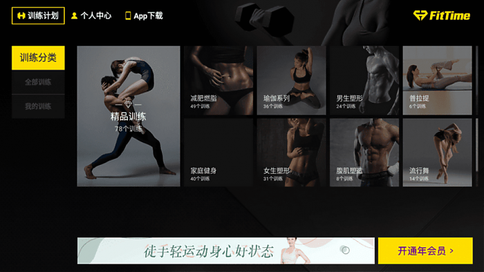 那么今天这个电视软件,爱健身的朋友非常有必要安装一下,明星小姐姐教练真实录制,超实用的健身教学,重点是免登无限制——运动健身TV_免登会员版